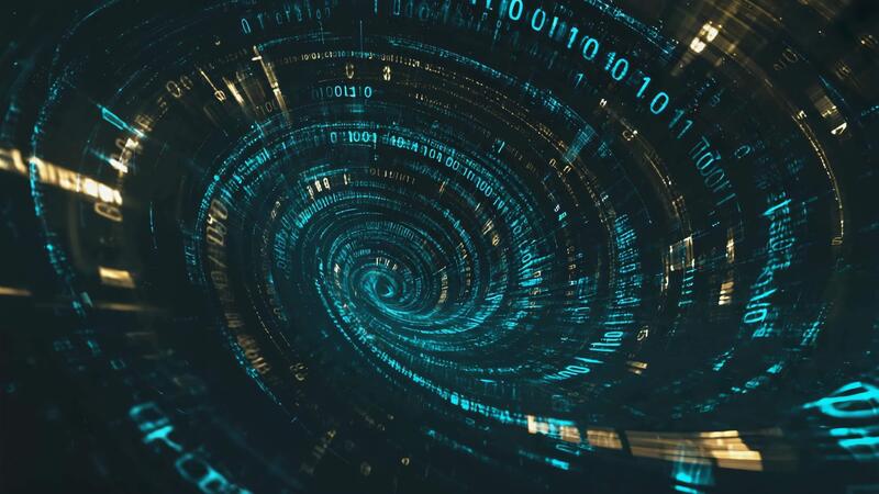 A digital vortex of binary code swirling in a tunnel with glowing blue and white data streams Free Video