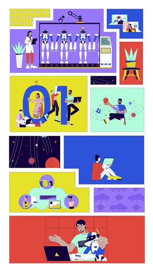 Technology science and virtual workspace animated bento grid layout. Cloud teamwork, coding. Robots with VR 2D animation flat cartoon ui collage design. Vertical 4K motion graphic collection Pro Video
