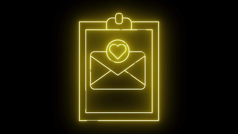 A yellow neonlit icon of an envelope with a heart inside displayed on a clipboard set against a black background Pro Video