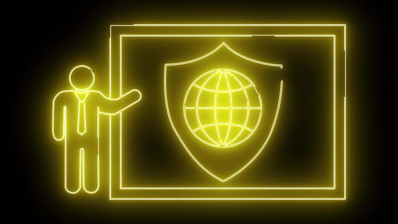 Yellow neon art of a person presenting a globe on a shield inside a frame against a black background Free Video