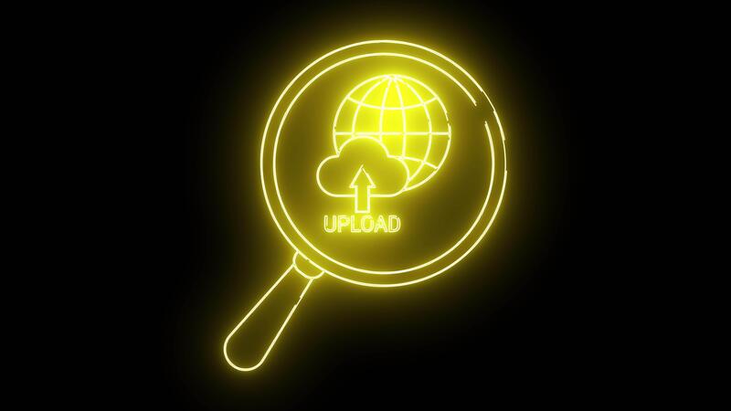 A neon yellow outline of a magnifying glass shows an upload icon above the word UPLOAD with a globe behind it Free Video