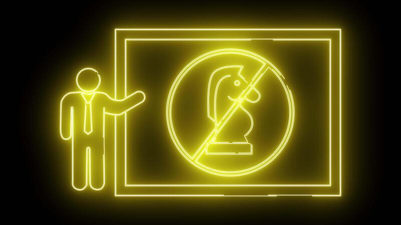 Illuminated neonyellow sign with a figure pointing towards a crossedout chess knight against a black background Free Video