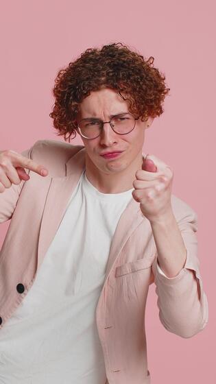 Greedy avaricious curly haired man in jacket showing fig negative gesture, you don't get it anyway. Rapacious, avaricious acquisitive. Body language. Refusal fig sign. Guy on pink background Pro Video