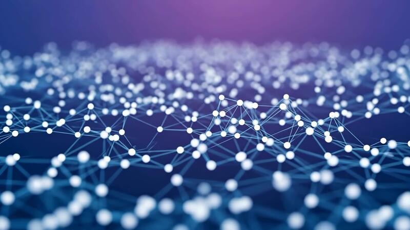 Abstract Network of White Spheres and Blue Lines on Dark Blue to Purple Gradient Background, Representing Connectivity, Data, Technology, and Science in a Modern Design 4k Pro Video