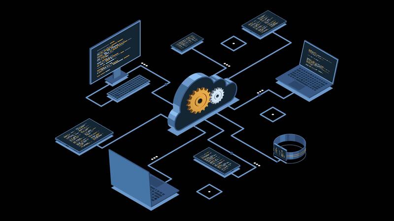 Isometric cloud technology computing animation. Isometric network with computer, laptop, tablet, and smartphone. Isometric technology. Transparent background with alpha channel. Free Video