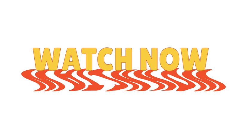 Animated bold cta button watch now with dynamic distorted shadow. Online content promotion. Thumbnail, viewer engagement. Orange text animation with psychedelic wavy effect. 70s funky motion graphics Pro Video