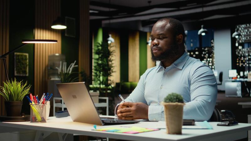 Black business consultant joining an online call meeting after hours, engaged in web discussion with shareholders. Professional guy interacting with people in networking session. Camera A. Pro Video