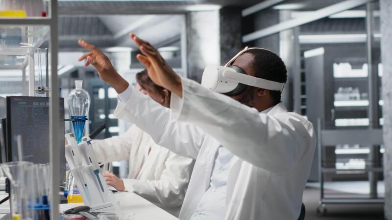 Scientist using computer and VR headset equipment for DNA data analysis in laboratory. African american man using bioinformatics genomics software and virtual reality tech in modern lab, camera B Pro Video