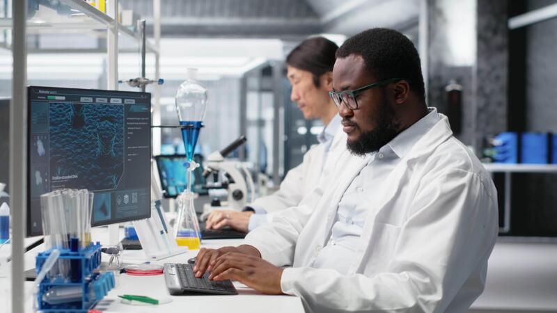 Laboratory bioinformatics scientist evaluates genetic markers using PC, analyzing sample properties. Man studies DNA strand mapping and chemical solution components using program on computer, camera B Pro Video