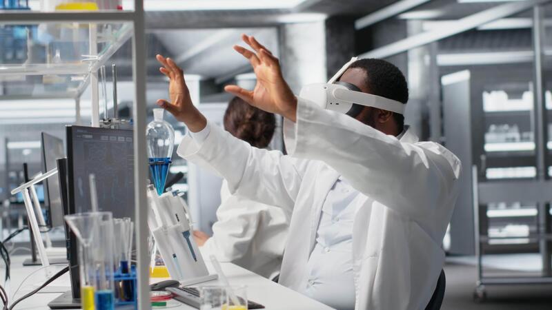 Lab engineer at PC desk using VR goggles to look at 3D molecular model, rotating it. Nanotechnology researcher using virtual reality simulation in medical lab, doing hand gestures, camera B Pro Video