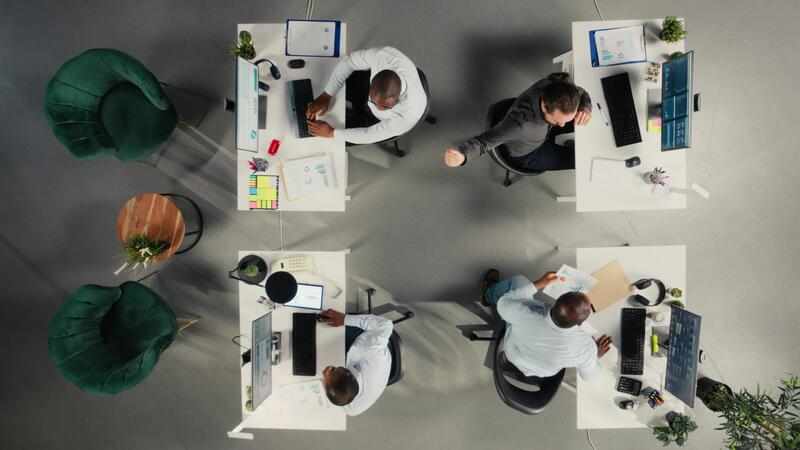 Top down view of employees reviewing charts and diagrams during briefing. Corporate team leads discussions on planning, documentation and report writing to enhance business intel. Camera A. Pro Video