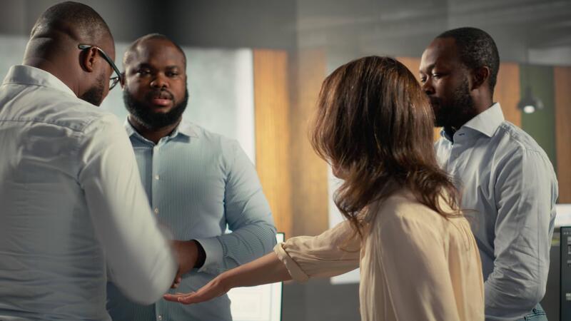 Multiethnic staff proud of their successful teamwork collaboration, clapping hands after business analysis. Employees use data visualization and forecasting for project objectives. Camera B. Pro Video