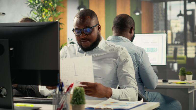 Professional business people analyze documents and graphs for risk assessment. Diverse work team collaborates on report writing, forecasting and performance metrics in office. Camera B. Pro Video