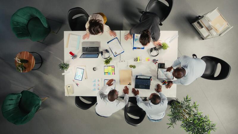 Top down view of colleagues presenting proposals and financial insights to shareholders during corporate event. Group collaborates on budgeting and planning for business development. Camera B. Pro Video