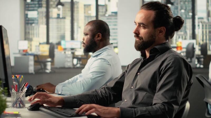 Corporate employees study business reports, charts, and analytics. Colleagues share insights on forecasting, documentation, and targets to improve growth strategy. Camera B. Pro Video