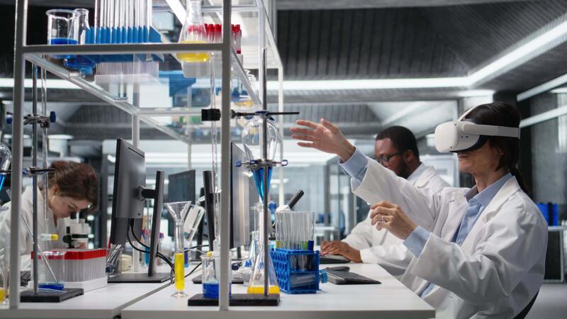 Lab specialist wearing VR headset equipment using chemical fluids for experiments. Chemist uses virtual reality device to simulate using solution laboratory glassware at workstation, camera A Pro Video