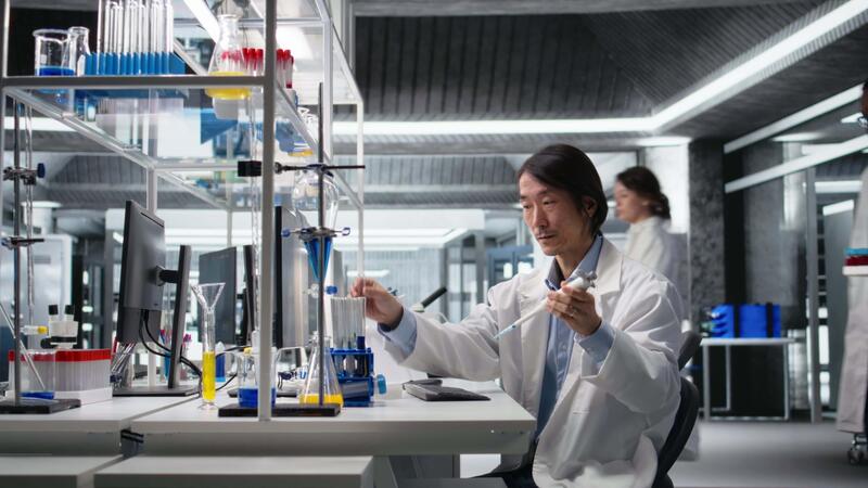 Lab engineer does pipetting procedure with chemical reagent, mixing solutions for reaction testing. Senior scientist uses pipette to transfer liquid into test tube, shaking to blend, camera A Pro Video