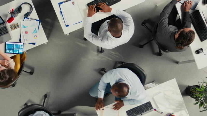 Top down view zoom out of business staff in modern office sharing insights and reports, team focuses on data visualization for efficient resource allocation. Company administration. Camera A. Pro Video