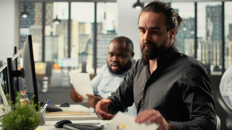 Coworkers group collaborate on report writing and data visualization, and analysis. The team focuses on performance objectives, management strategy and efficient report sharing. Camera B. Pro Video