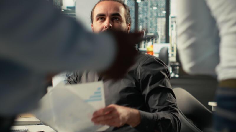 Business people discuss development strategies and analytics using documents. Professional employees review documentation, forecasts, and insights to enhance corporate planning. Camera B. Pro Video