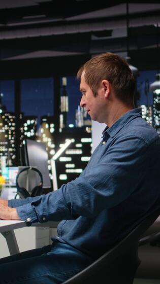 Vertical Portrait of male engineer uses architectural software and blueprints for 3D render of a home interior. Program allows to configure furniture and design elements for a virtual layout. Camera A. Pro Video