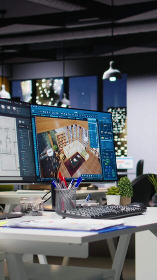 Vertical Empty design office with modern desk showcasing blueprint drafting and 3D modeling software on screen. Digital workspace emphasizes creative visualization in a professional environment. Pro Video