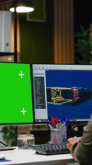 Vertical Green screen next to african american woman working on game developing, using multiple monitors at the office. Female engineer creating a futuristic spaceship station on software. Camera B. Pro Video
