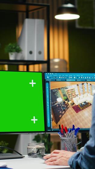 Vertical Green screen and CAD software used by IT engineer architect to create modern floor plan, 3D modeling program and mockup on dual monitors. Architectural design virtual assets. Camera B. Pro Video