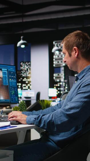Vertical Expert designer decorating apartment floor plan using blueprints on pc, using architectural software to configure elements. Focused man uses interface to enable rendering and 3D modeling. Camera A. Pro Video