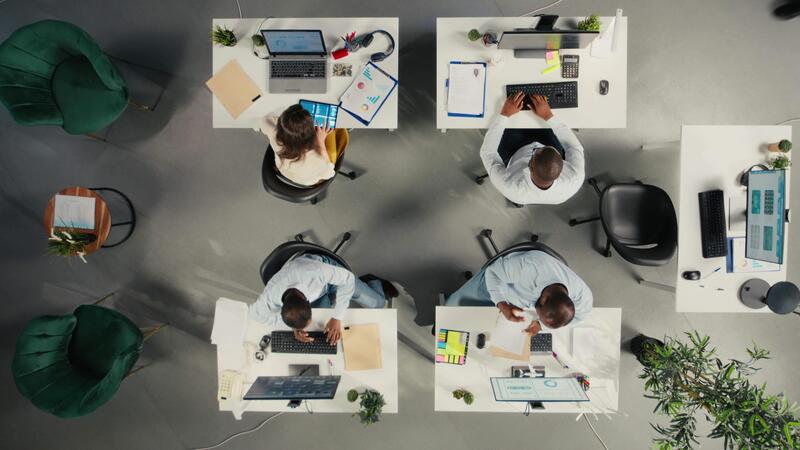 Top down view of coworkers engaged in consulting and report sharing at office. Professional team reviews visual data and documents to enhance business strategy and performance goals. Camera A. Pro Video