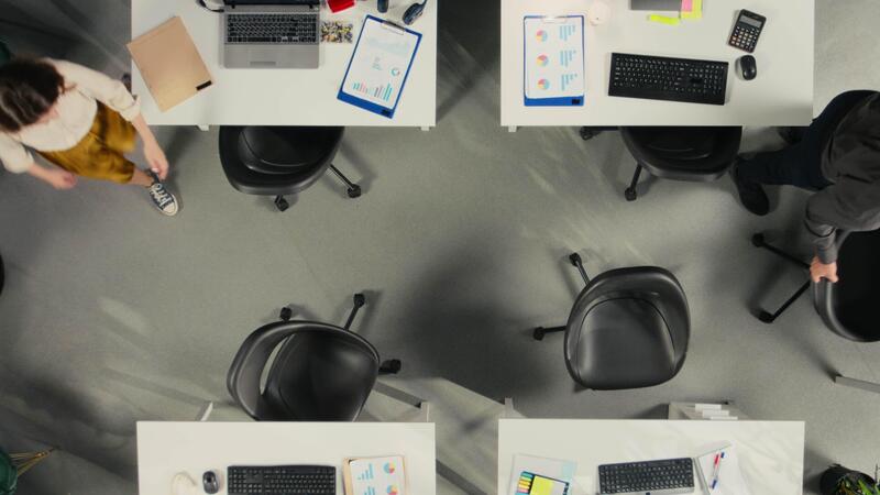 Top down view zoom out of staff in office discuss business strategy and market research. Diverse coworkers evaluate documents and diagrams to align goals, targets and performance metrics. Camera A. Pro Video