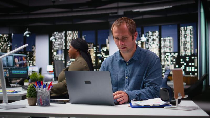 Business manager in modern workplace sharing insights and reports, focusing on data visualization for efficient resource allocation. Successful company administration and management. Camera A. Pro Video