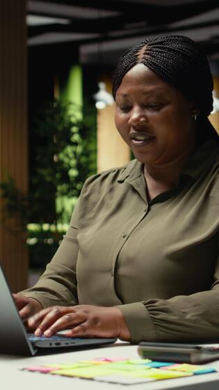 Vertical Female business consultant typing data reports and fact checking on laptop, planning project and scheduling tasks after hours. Notetaking and handwriting for objectives achievement. Camera A. Pro Video