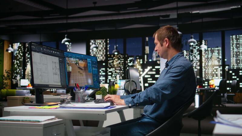 Portrait of male engineer uses architectural software and blueprints for 3D render of a home interior. Program allows to configure furniture and design elements for a virtual layout. Camera A. Pro Video