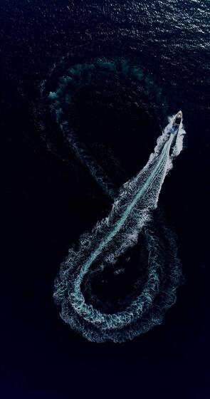 Drone top view of a motorboat creating an infinity loop on turquoise sea, representing freedom, future, endless adventure, and the spirit of summer in nature. Vertical format. Pro Video