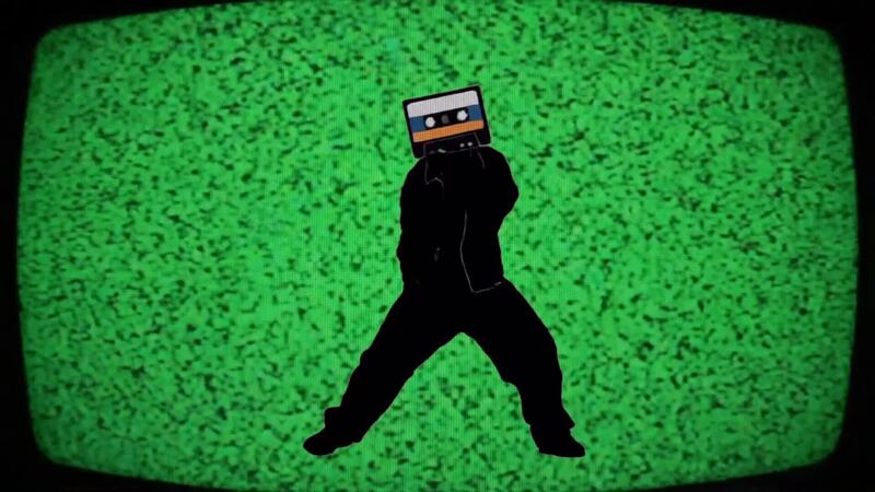 Retro glitchy TV distortion over green screen silhouette cassette-head dancer, analog static loop perfect for VJ backgrounds Pro Video