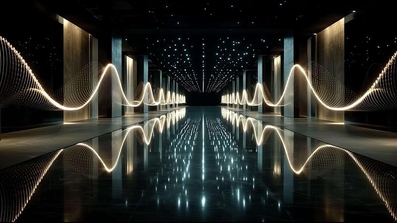 Futuristic neon-lit corridor with undulating wave patterns reflecting on a glossy floor under a starry void, evoking sci-fi immersion. Free Video