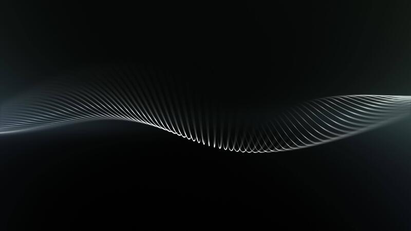 Black background of an isolated white wave. Cinematic glow and blue digital waves. Abstract wave of gradient particles flow smoothly with soft dark green light and bokeh. Technology, engineering, Pro Video