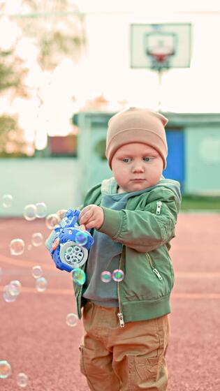 A two year old boy plays on the playground with soap bubbles A gun with soap bubbles in the hands of a little boy Pro Video