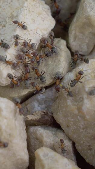 Vertical Screen Stone surface with many tiny ants moving around. The ants are reddish-brown and appear to be looking for food or exploring the area. The surface they are on looks like a piece of Pro Video