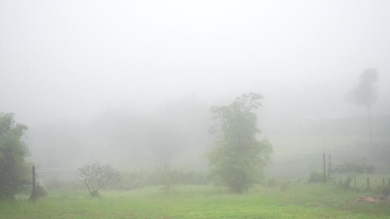 Serene Landscape with Mysterious Fog and Trees in a Lush Green Field Under a Dreamy Atmosphere in a Tranquil Natural Setting Free Video