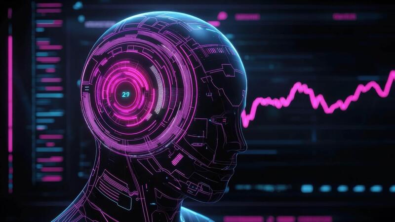 Futuristic humanoid robot with digital interface displaying data and analytics in a high-tech setting, showcasing advanced technology and innovation concepts Free Video