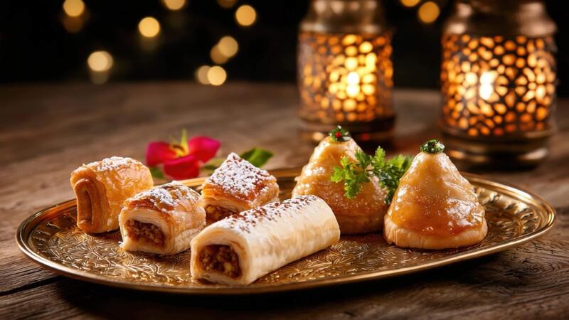 Assorted Middle Eastern Pastries on Ornate Plate with Soft Bokeh Background of Lanterns and Mood Lighting for Cultural and Culinary Themes Free Video