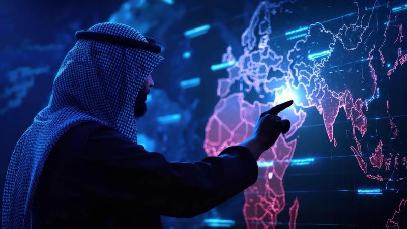 Man in Traditional Attire Analyzing Digital World Map with Cyber Elements and Geographical Data Visualization in Futuristic Setting Free Video