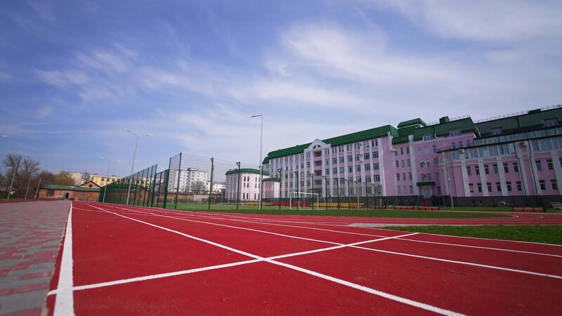 Approaching a soccer field surrounded by fence in front of the big pink building. Red running track at the foreground. Low angle view. Pro Video