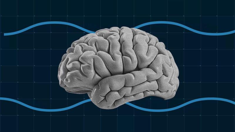 Human brain animation with a blue sine wave moving across it on a dark grid background for a mind concept Pro Video