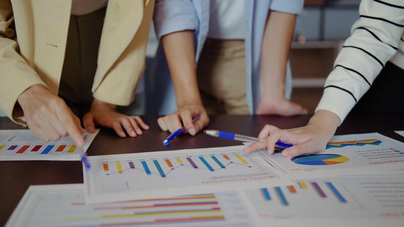 Close up hands of asian young business professionals engage in a dynamic brainstorming session, They collaborate on strategies using charts and papers, showcasing teamwork, agenda or charts paper Pro Video