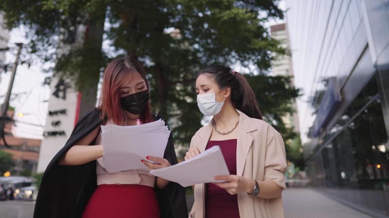 Two hard working asian office workers weat surgical mask holding work paper walking and discuss project briefing, work pressure and stress, solving problem on working site, meeting preparation qa Pro Video