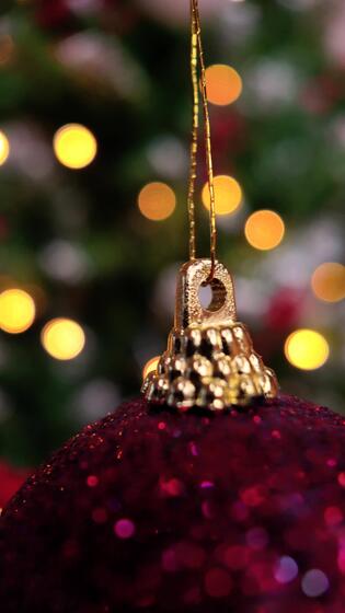 Slow motion macro closeup of a red glitter Christmas ornament gently swaying in a vertical static frame with soft festive lighting Pro Video