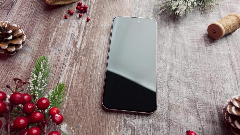 Slow motion top view of a smartphone surrounded by subtle festive elements while the camera moves smoothly to the right Pro Video
